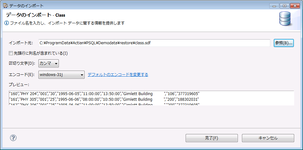 [データのインポート]では、ファイルのエンコードの変更や、デフォルトのエンコード設定が可能になりました。さらに、[プレビュー]領域では、選択したファイル名、ファイル エンコード、およびその他のオプションに基づくデータのプレビューを表示します。たとえば、次の図は、PSQL で提供する class.sdf テーブルをインポートしようとしている画面です。[エンコード]フィールドには "windows-31j" が設定されています。[プレビュー]領域には、設定したエンコードで、区切り文字が "カンマ"、先頭行に列名が含まれていない([先頭行に列名が含まれている]オプションがオフ)場合に、ファイルのデータがどのように見えるかを表示しています。