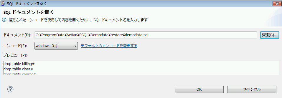 次の図は、PSQL で提供されるサンプル ファイル demodata.sql を選択しようとしているダイアログ ウィンドウです。プレビューには、このファイルの冒頭の数行が表示されます。