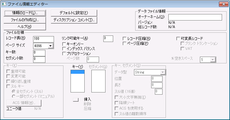 このセクションでは、構築するファイルおよびキー仕様に基づいて新しいファイルを作成する[ファイル情報エディター]に関する一般的な説明を行います。このエディターでは、既存ファイルの情報をロードできるため、既存データ ファイルのファイル仕様やキー仕様の確認に便利です。また、既存ファイルのファイル仕様やキー仕様に基づいた新規ファイルの作成も可能です(コマンド ライン Maintenance ツールである butil の clone コマンドと同様)。