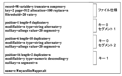 キー 1 は、このファイルのログに使用されるキーです。これは 1 つのセグメントで構成されます。ポジション 1 から始まり、長さが 6 バイト、重複不可、変更可能、そして string 型として保存されます。16 個の重複しないキー値が、このキーに挿入されています。このキーでは、オルタネート コレーティング シーケンス ファイル upper.alt が使用されます。