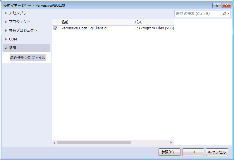 3 "Pervasive.Data.SqlClient.dll" を選択して[追加]をクリックします。[参照マネージャー]ウィザードの[参照]タブで、[最近使用したファイル]項目に Zen データ プロバイダー アセンブリが表示されます。