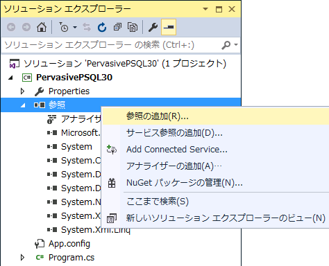 1 ソリューション エクスプローラーで[参照]を右クリックし、[参照の追加]を選択します。