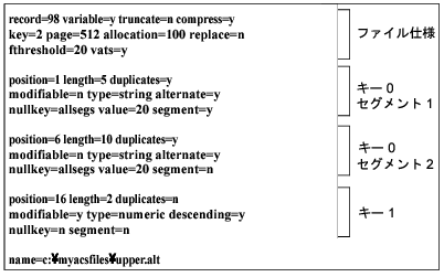 キー 1 は、このファイルのログに使用されるキーです。これは 1 つのセグメントで構成されます。ポジション 1 から始まり、長さが 6 バイト、重複不可、変更可能、そして string 型として保存されます。16 個の重複しないキー値が、このキーに挿入されています。このキーでは、オルタネート コレーティング シーケンス ファイル upper.alt が使用されます。