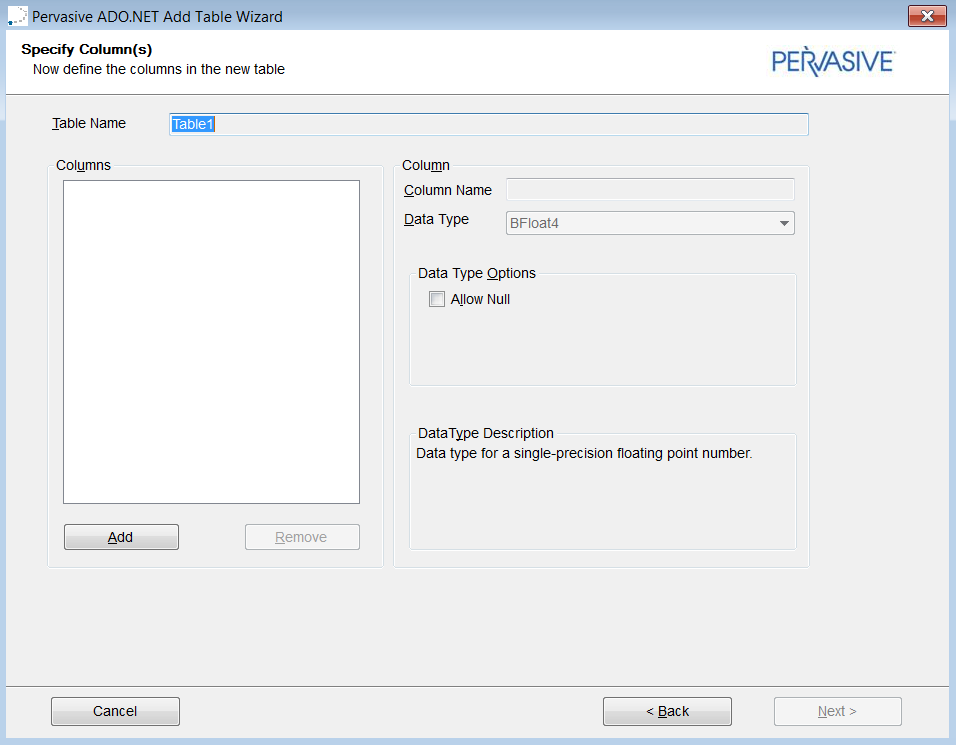 3 [Tables]ノードを右クリックし、[Add New Table]をクリックします。Zen ADO.NET Add Table Wizard が表示されます。