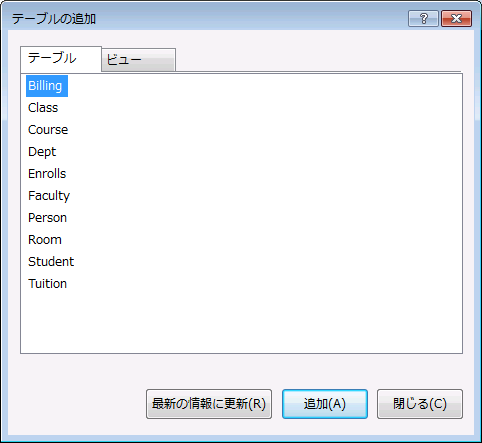 4 [テーブルの追加]ウィンドウが表示されます。使用するデータが入っているテーブルを選択したら、[