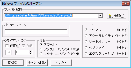 モード | ファイルを開くときの状態を設定します。この状態に基づき、データベース エンジンは開くファイルに適用する条件を識別します。たとえば、ファイルの読み取りは可能だが更新はできない(リードオンリー)という条件が可能です。 | モードの説明については、『Btrieve API Guide』を参照してください。 |
