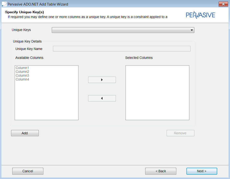 •[Available Columns]リスト ボックスで一意なキーの指定に使用する列を 1 つ以上選択し、[Selected Columns]リスト ボックスに移動します。