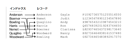 前の例では、ラスト ネーム キーのインデックスがラスト ネーム値をソートし、レコードがデータ ファイル内のどこにあるかを示すポインターを持っています。