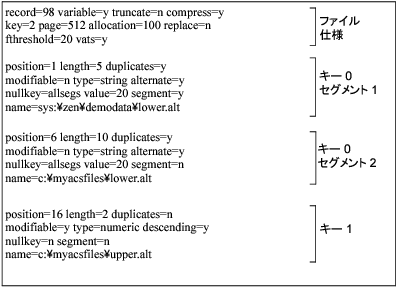 このセクションにあるディスクリプション ファイルのサンプルは、データ ファイルの説明です。このデータ ファイルのページ サイズは 512 バイトで、キーは 2 つです。レコードの固定長部分は 98 バイトです。ファイルで可変長レコードは使用可能ですが、ブランク トランケーションは使用できません。