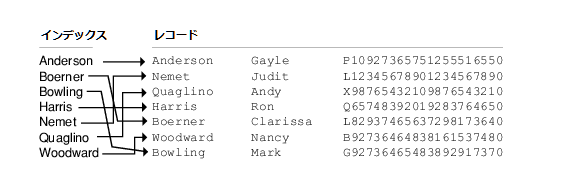 前の例では、ラスト ネーム キーのインデックスがラスト ネーム値をソートし、レコードがデータ ファイル内のどこにあるかを示すポインターを持っています。