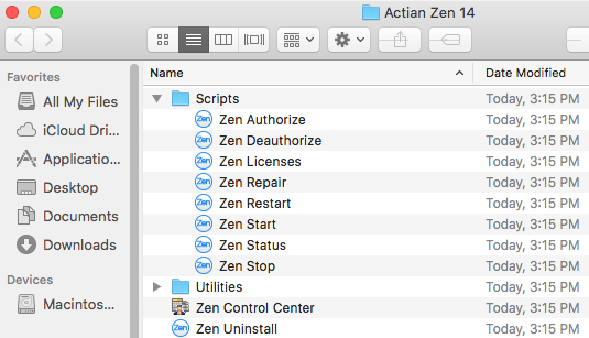 Zen Start | /usr/local/actianzen/etc/init.d/actianzen start、status | 詳細については、Linux、macOS および Raspbian 上でのデータベース エンジンの起動と停止を参照してください。 |