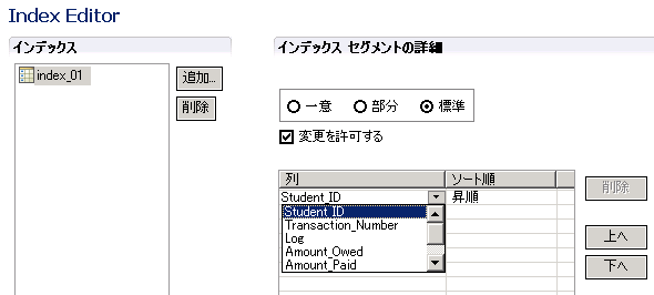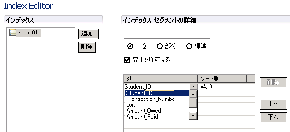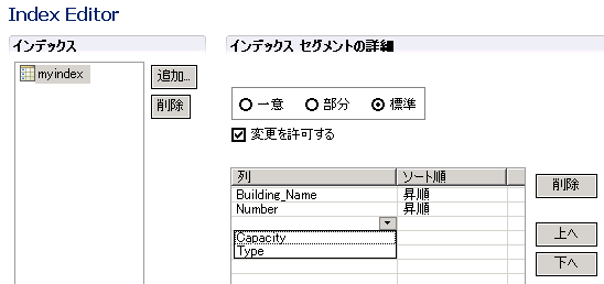 [インデックス]ページでは、インデックスおよびインデックス セグメントの追加と変更ができます。[列]ページで実行できるタスクについては、