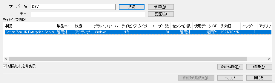• 期限切れ - キーは現在使用できません。一時キーは評価期間が過ぎると状態が "期限切れ" になります。