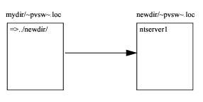 次の図に示したロケーター ファイルの例を使用すると、左側のリダイレクト ロケーター ファイルはデータベース エンジンに 1 つ上のディレクトリに行き、そのサブディレクトリの newdir でデフォルト名(~PVSW~.LOC)を持つ別のロケーター ファイルを探すように指示しています。今度は、このロケーター ファイルが ntserver1 という名前のコンピューター上にあるワークグループ エンジンがゲートウェイ エンジンであることを指定します。その結果、mydir ディレクトリにあるデータ ファイルにアクセスするために、ntserver1 にあるデータベース エンジンが使用されます。