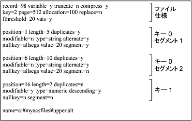 オルタネート コレーティング シーケンス(ACS) | alternate=<y|n> | 適用外 | 大文字小文字を区別する STRING や LSTRING、WSTRING、WZSTRING、ZSTRING キーのみに適用できます。既存ファイルにインデックスを追加作成する際に、そのインデックスでデータ ファイルの最初にある ACS 以外の ACS を使用する場合は、caseinsensitive=y と共に使用します。 |
