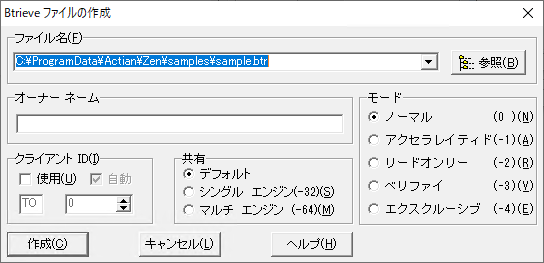 モード | ファイルを開くときの状態を設定します。この状態に基づき、データベース エンジンは開くファイルに適用する条件を識別します。たとえば、ファイルの読み取りは可能だが更新はできない(リードオンリー)という条件が可能です。 | モードの説明については、『Btrieve API Guide』を参照してください。 |
