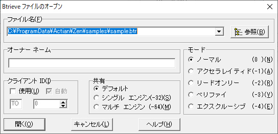 モード | ファイルを開くときの状態を設定します。この状態に基づき、データベース エンジンは開くファイルに適用する条件を識別します。たとえば、ファイルの読み取りは可能だが更新はできない(リードオンリー)という条件が可能です。 | モードの説明については、『Btrieve API Guide』の Open(0) を参照してください。 |