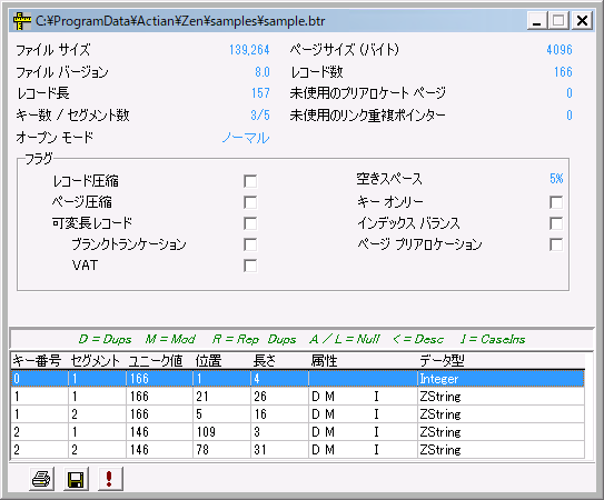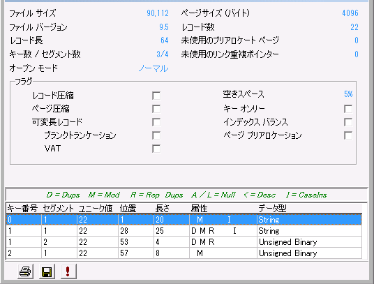 キーの凡例 | 1 文字の値でこのファイルのキー属性を示します。 • D = DUP(重複可能) • M = MOD(変更可能) • R = REPEAT_DUPS_KEY(繰り返し重複キー) • A= NUL(全セグメント ヌル キー) • L = MANUAL_KEY(一部セグメント ヌル キー) • < = DESC_KEY(キー値を表します) • I = NOCASE_KEY(大文字小文字無視キー) 『Zen Programmer's Guide』のキー属性も参照してください。 |
