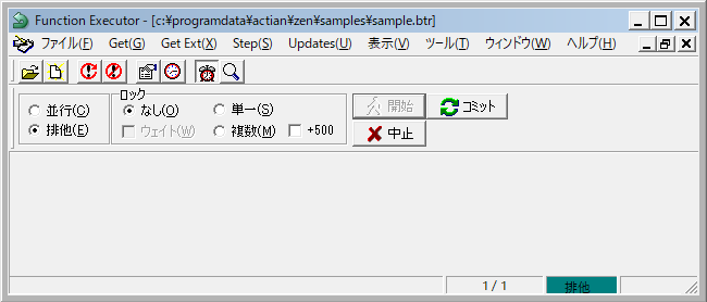 [ファイル]メニュー | 以下のコマンドおよび Btrieve オペレーションが実行できます。 • Login および Logout • Open および Close • New • Print Setup • Set Owner Name および Clear Owner Name • Continuous オペレーションの開始または終了 • Reset、Stop および Exit | |