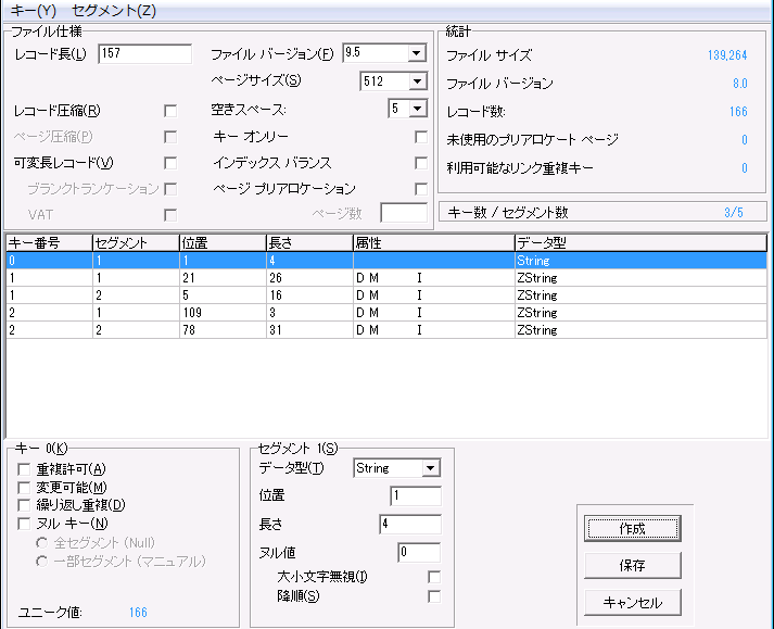 キーとセグメントの行列 | ファイルのキーとセグメントの開始位置、長さ、属性およびデータ型を表示します。行をクリックすると、下方のキーとセグメントの各ブロックで情報が表示されます。必要であれば、この情報は変更することもできます。 | |
