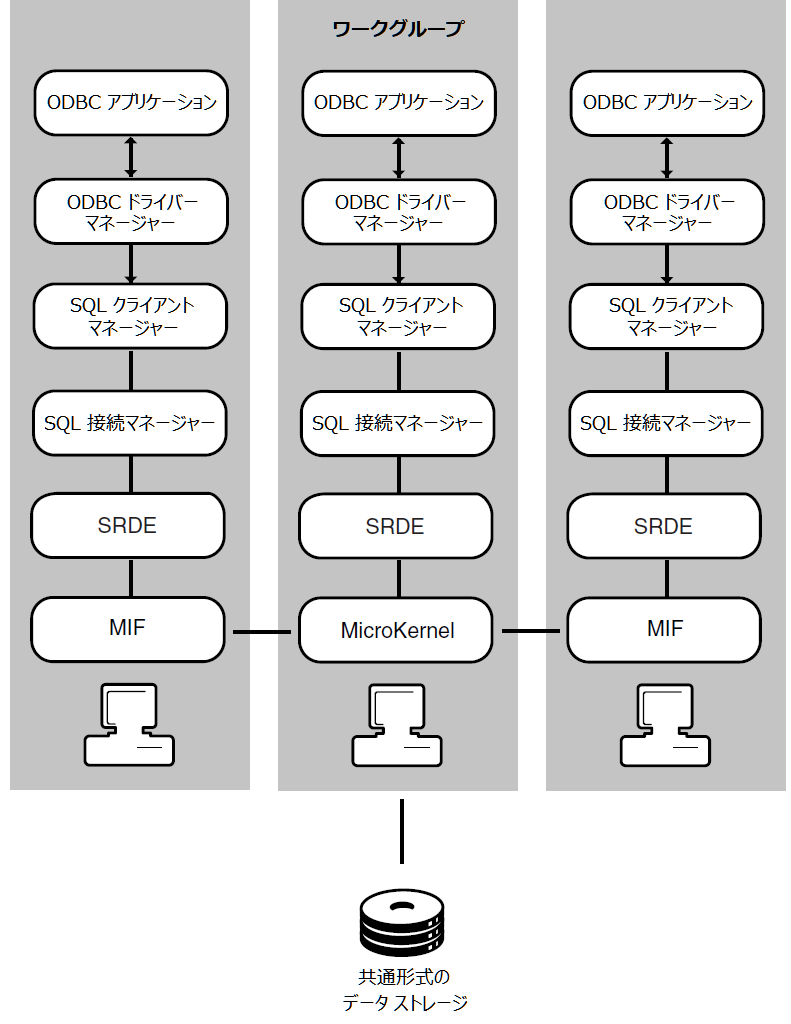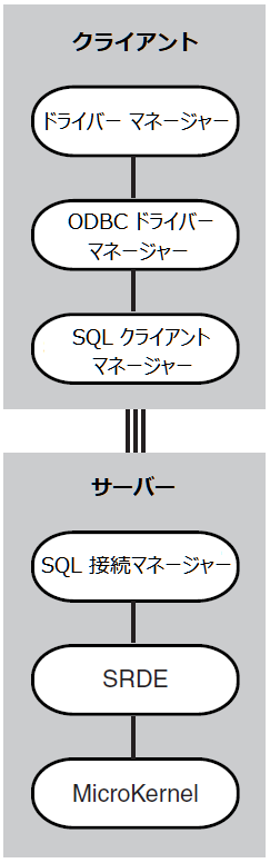 SQL 接続マネージャーは、最大 2000 までの同時接続をサポートしており、ODBC ドライバー マネージャーを使用してリレーショナル エンジン(SRDE:SQL Relational Database Engine)を呼び出します。エンジンは MicroKernel の上に置かれます。