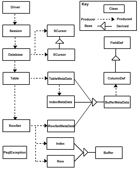 「ファクトリ」パターンを適用することにより、Driver、Timestamp、FieldDef、および PsqlException を除く、ほとんどすべてのクラスは(単一または複数の)ほかのクラスのメソッドを通してのみ作成できます。クラスの説明で、パブリック コンストラクターが使用できない場合、ラベル Constructors の下にコンストラクターのリストは表示されません。