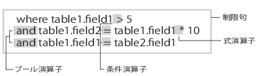 • ブール演算子 – 制限句の条件を連結します。
