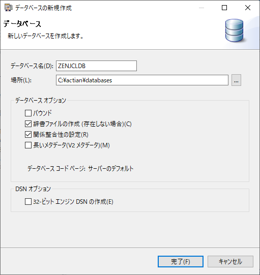 新しいデータベースに ZENJCLDB という名前を付け、データベースの適切な場所を選択します(この例では、C:\actian\databases を使用します)。残りのオプションは、デフォルトの設定のままにしておきます。