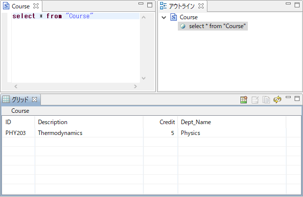 最後に、RowSet オブジェクトの getByIndex() メソッドを、比較演算子と Index オブジェクトを指定して呼び出し、目的の行(ID が PHY203 の行)を取得します。一致する行が見つからない場合は、PsqlOperationException がスローされるので注意してください。エラー コードは、見つからなかったことを示す 4 です。エラー コードが 4 でない場合は、何か他の問題が発生しています。