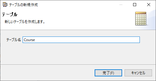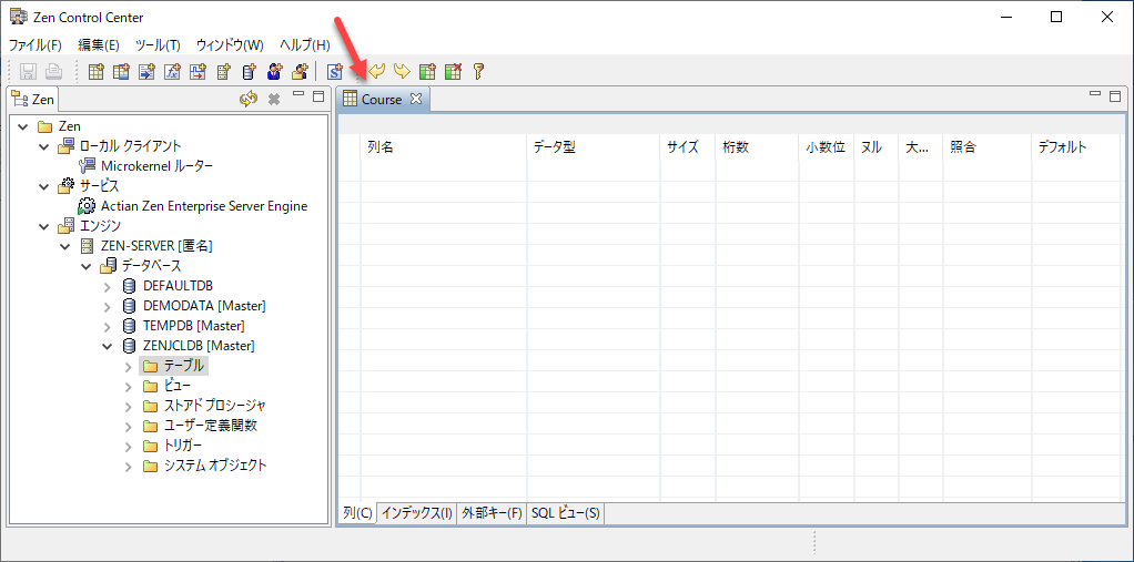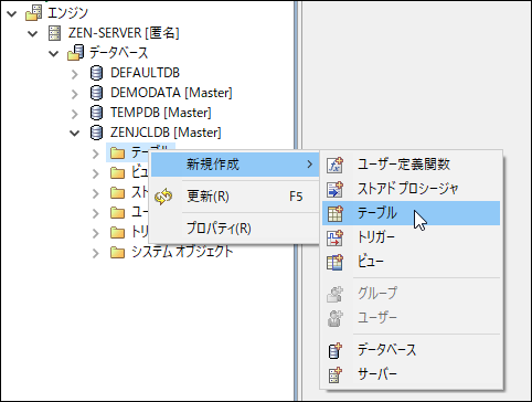 ツリーの ZENJCLDB ノードの下の[テーブル]を右クリックし、[新規作成]>[テーブル]を選択して、このデータベースに新しいテーブルを追加します。