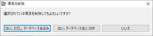 - データベース名のみを削除した場合、そのデータベース名は ZenCC に表示されなくなり、SQL ステートメントを受け入れることができなくなります。ただし、サポートしているメタデータ、データ辞書ファイル(DDF)は、テーブルの作成に使用するデータ ファイルと一緒に残ります。同じ場所にデータベースを再作成する場合は、以前のデータベースのデータ ファイルおよびメタデータを再利用できます。