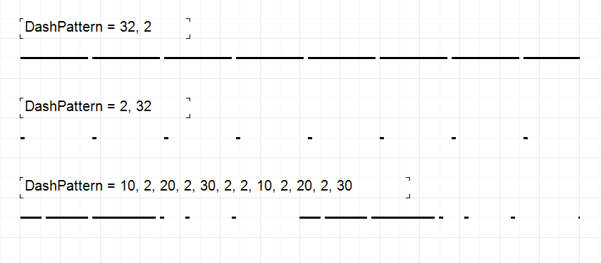 たとえば、値 5、4、3、2 を指定すると、ストロークの長さ 5、スペースの長さ 4、ストロークの長さ 3、スペースの長さ 2 に設定されたパターンが表示されます。その後、値は 5 から始まるサイクルで繰り返されます。ここでの測定単位は Border.Width です。