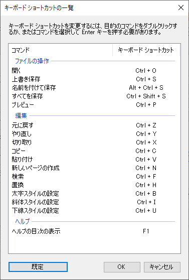 操作と操作に割り当てられているキーボード ショートカットの表が示されます。目的の行をダブルクリックして、組み合わせを変更することができます。また、上下矢印キーを使用して表内を移動し、Enter キーを押して変更を行うこともできます。すべての組み合わせを既定の値に戻すこともできます。
