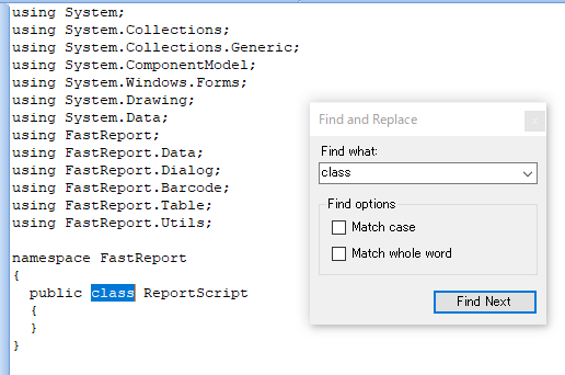 FastReport .NET コード エディターだけでなく、FastReport WPF および FastReport Mono のコード エディターでもテキストを検索できるようになりました。