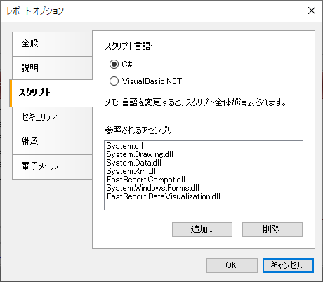 式 FastReport では多くの場所で式が使用されます。たとえば、テキスト オブジェクトには角かっこで囲まれた式を含めることができます。 式は C# または VB.NET 言語のコードであり、値を返します。たとえば、次のように指定します。 2 + 2 式はレポートのスクリプトとして選択した言語で記述する必要があります。言語の既定値は C# です。この言語は[レポート オプション]ダイアログ([レポート]メニューの[オプション]を選択)の[スクリプト]タブで変更できます。