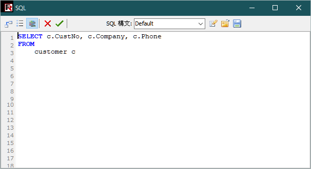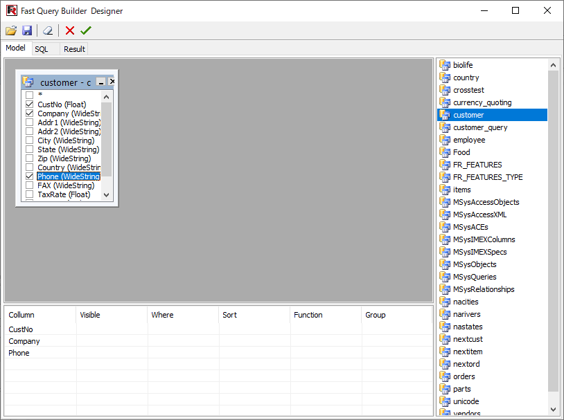 ボタンをクリックすると、クエリ ビルダーのウィンドウが開きます。テーブルの一覧で Customer テーブルを選択し、それを作業領域にドラッグします(または、テーブルをダブルクリックします)。CustNo、Company、および Phone フィールドを選択します。